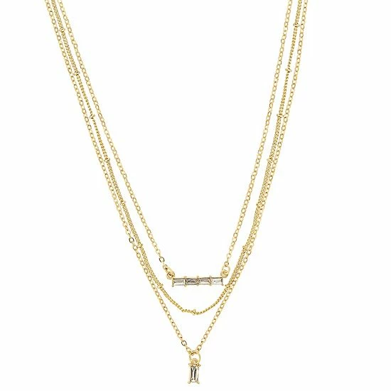 Layer on the style with this LC Lauren Conrad Gold Tone 3 Row Clear Baguettes and Simulated Pearl Bar and Pendant Necklace.
