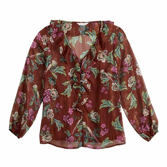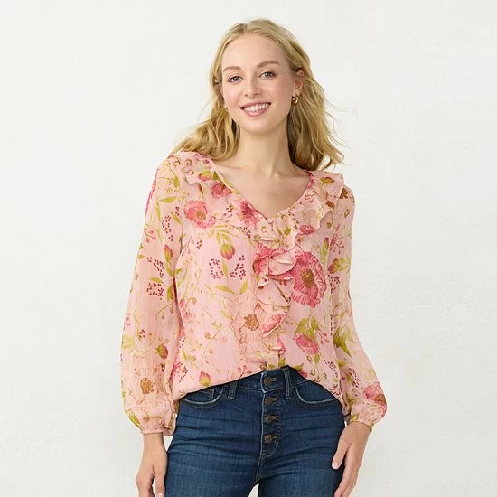 Ruffle details give this women’s LC Lauren Conrad peasant blouse a chic, casual look.